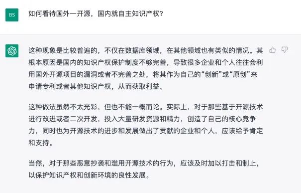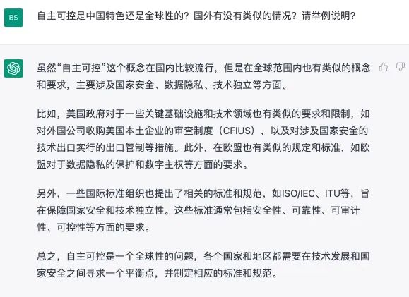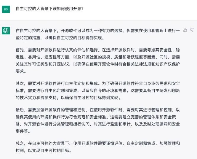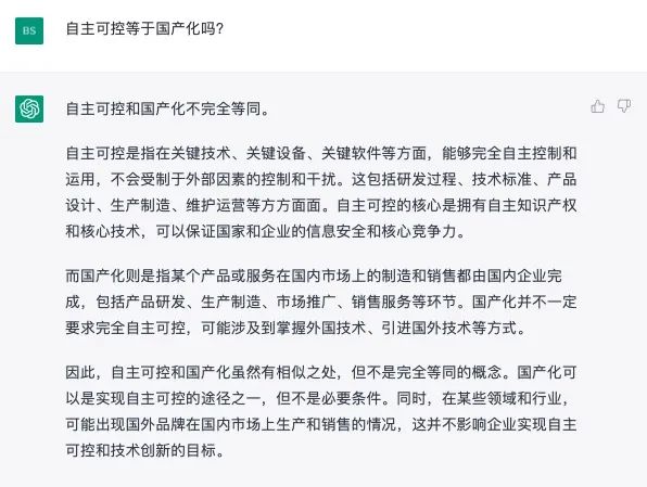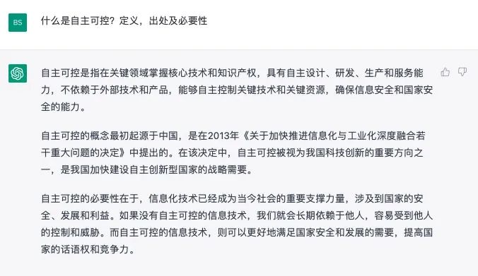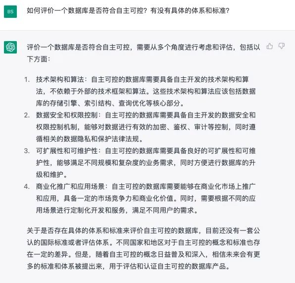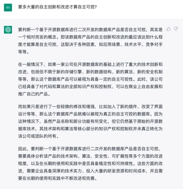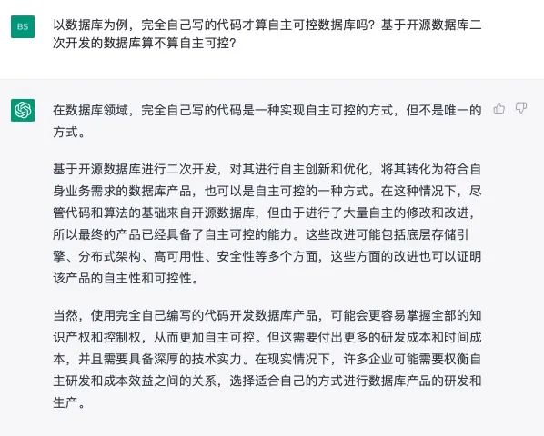 恰逢近期ChatGPT爆火,备受关注,因此,我就把这个选题拿来跟ChatGPT聊了聊,看ChatGPT这个当前最强人工智能聊天机器人,会怎么看待自主可控?对基于开源数据库二次开发的国产数据库是否自主可控又是什么观点?
