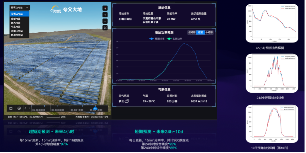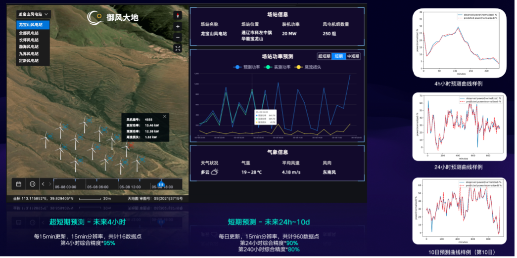 大地量子作为国内外领先的专业时空大数据服务商,利用人工智能和卫星的力量,可以妥善地解决这个棘手问题。大地量子新能源功率预测系统基于端到端的 AI 气象预报系统与电站 SCADA 数据,可快速构建场站级的超短期和短期功率预测 AI 模型,为光伏电站和风力场站提供高精度的发电功率预测服务,帮助新能源发电企业提高发电效率、减少并网考核,配合电网调度部门促进新能源消纳。