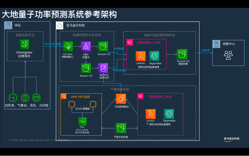 大地量子在新能源高精度的功率预测业务中全面使用了亚马逊云科技提供的多样化的云服务,其中包括:Amazon S3、Amazon FSx for Lustre、Amazon SageMaker、Amazon Lambda,并成功地使用亚马逊全球云服务和 GPU 资源来处理海量气象数据,为实现精准天气预报提供了最佳的系统化算力能力,并且避免了网络传输造成的延迟和成本浪费。Amazon FSx for Lustre 可为数以千计运行 PB 级数据的复杂分析工作负载的计算实例提供支持, 还可以加速机器学习(ML)的进程,借助最大化对计算资源的吞吐量,以及无缝访问存储在 Amazon S3 中的培训数据,可以缩短培训时间,不仅为大地量子提供了 PB 级数据分析的计算能力,还结合亚马逊云科技智能化计算和编排服务,对精准天气预报所需的高性能计算工作负载提供了全面支持。Amazon SageMaker 是一项完全托管的机器学习服务,数据科学家和开发人员可以快速、轻松地构建和训练机器学习模型,然后直接将模型部署到生产就绪的托管环境中。它提供了一个集成的 Jupyter 编写 Notebook 实例,可以轻松访问数据源以便进行探索和分析,因此您无需管理服务器。此外,它还可以提供常见的机器学习算法,这些算法经过了优化,可以在分布式环境中高效处理非常大的数据。大地量子通过Amazon SageMake服务,构建了在线推理服务,实现了 Notebook 对模型试训练,并且把复杂的模型训练管理起来。当模型在工业环境中应用出现问题后,还可以追溯问题并尽快解决。利用亚马逊云科技丰富而强大的云服务,将天气预报的精准数据与风场本地的运营数据结合,通过云端的数值模拟和机器学习模型的不断优化和迭代,最终实现风电功率预测精准度的大幅提升,为促进和提升新能源业务的发展提供了最佳实践。