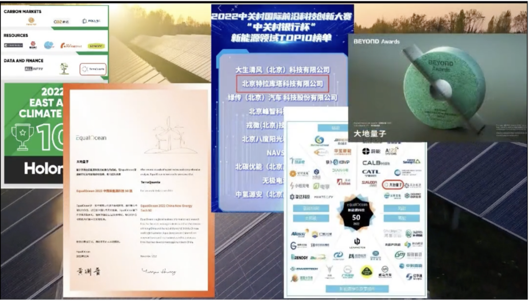 大地量子在新能源产业方向上的技术积累也得到了中关村前沿科技创新大赛等众多优秀同行和大赛的认可和奖项。如在2022年11月大地量子荣登 EqualOcean 新能源科技50强榜单。国际奖项方面,近期大地量子荣登了 HolonIQ 亚洲气象技术 TOP100。
