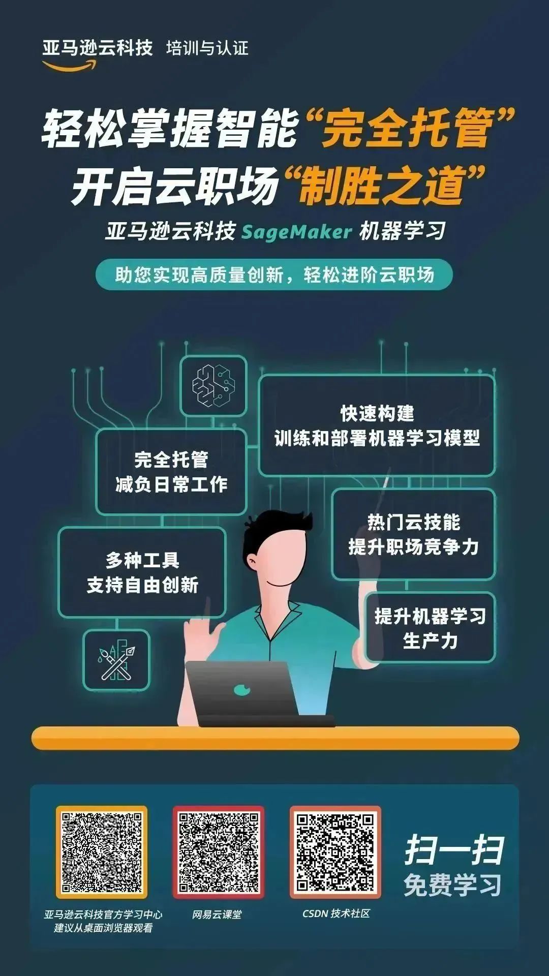 让亚马逊云科技的 SageMaker 帮你排除一切挑战。一键部署,允许检测并修正概念偏差,通过人工审查验证预测、自动部署、扩展和管理容器化应用程序,还能将机器学习推理成本降低多达75%。
