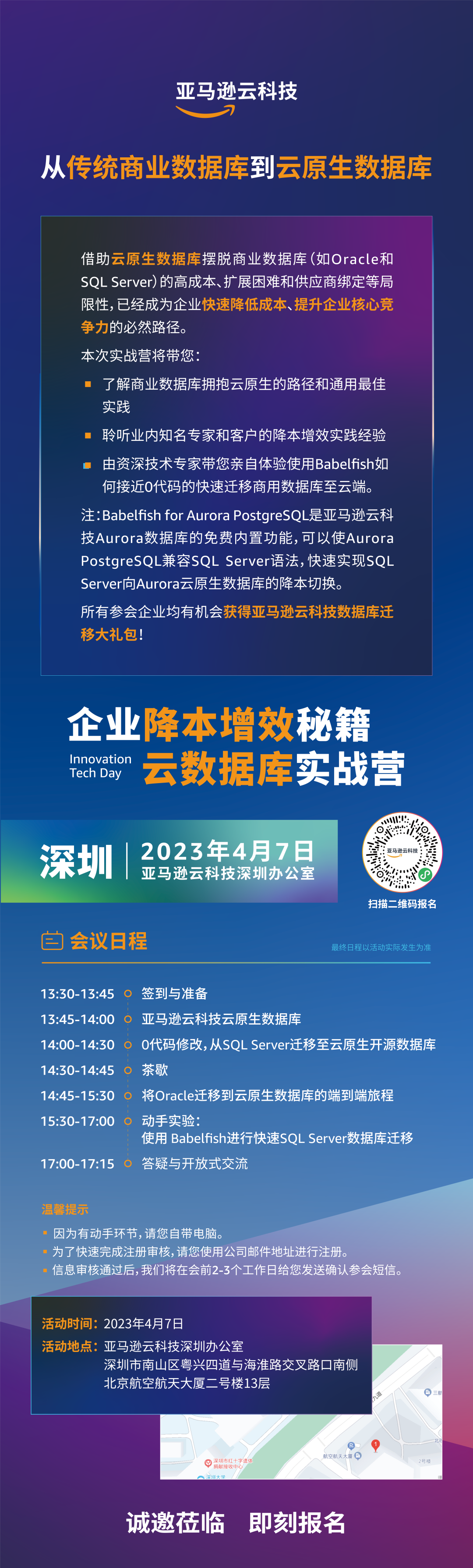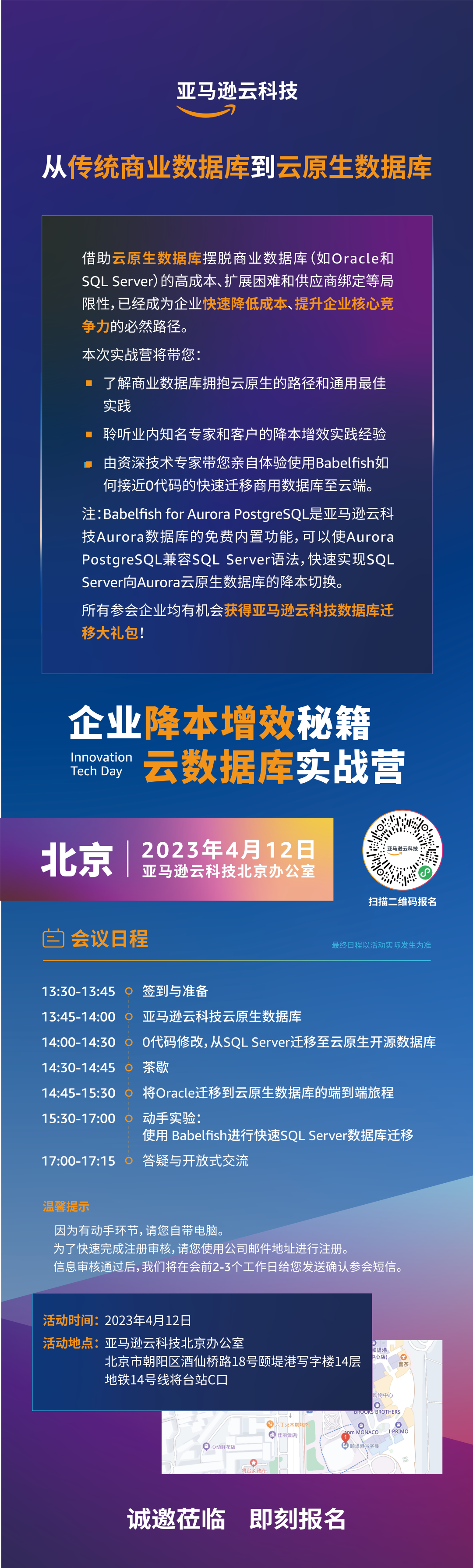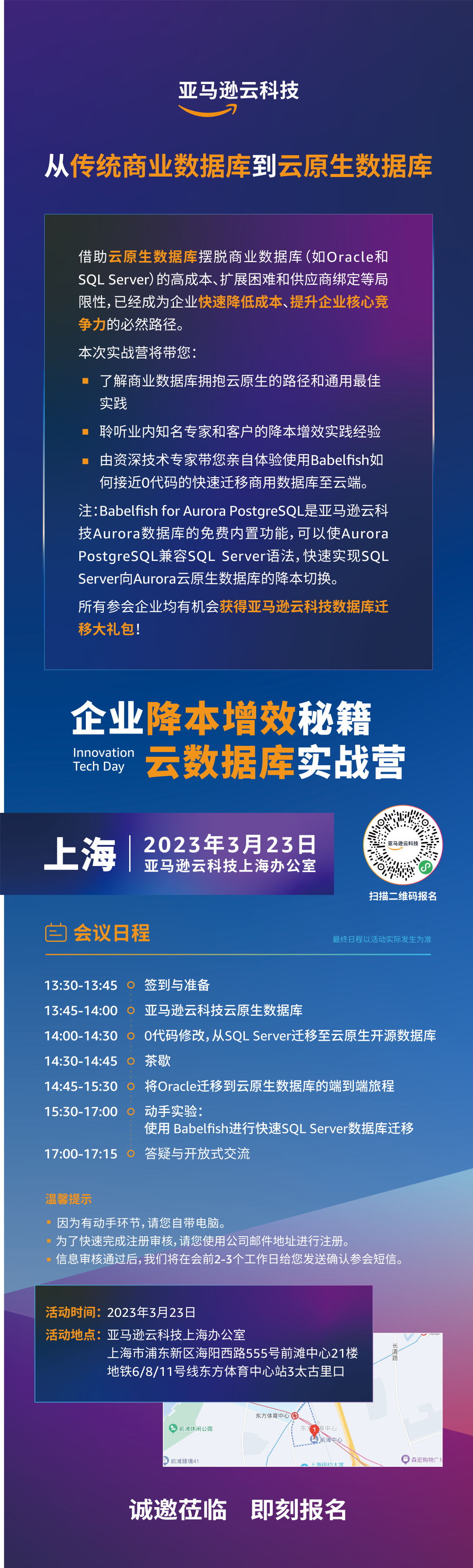 所有参会企业均有机会获得亚马逊云科技数据库迁移大礼包!体验如何将数据库使用成本最高降低50%以上。