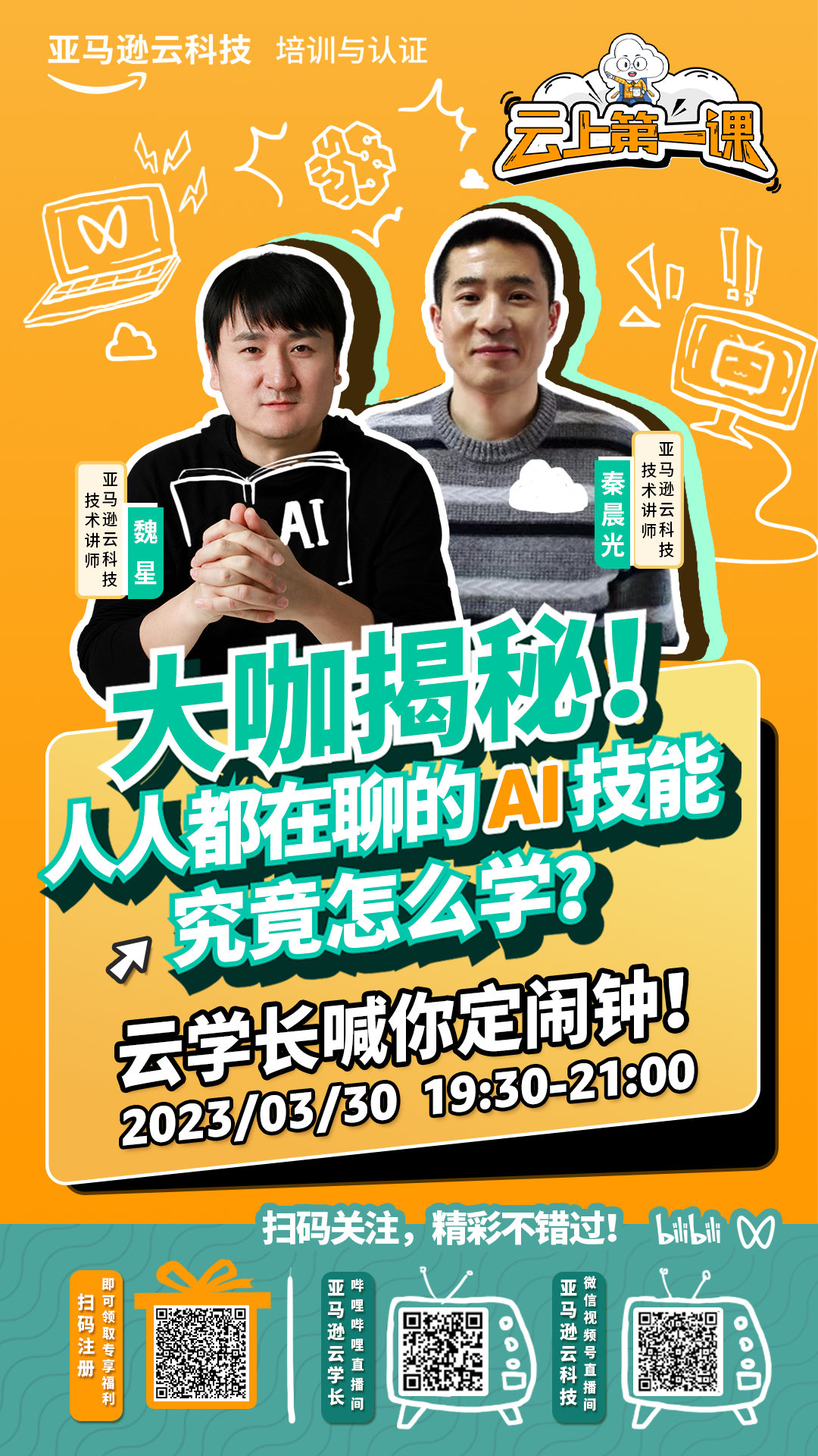 3 月 30 日 19:30,《云上第一课|大咖揭秘!人人都在聊的 AI 技能究竟怎么学?》,2023 年首次亮相,准备开讲啦!