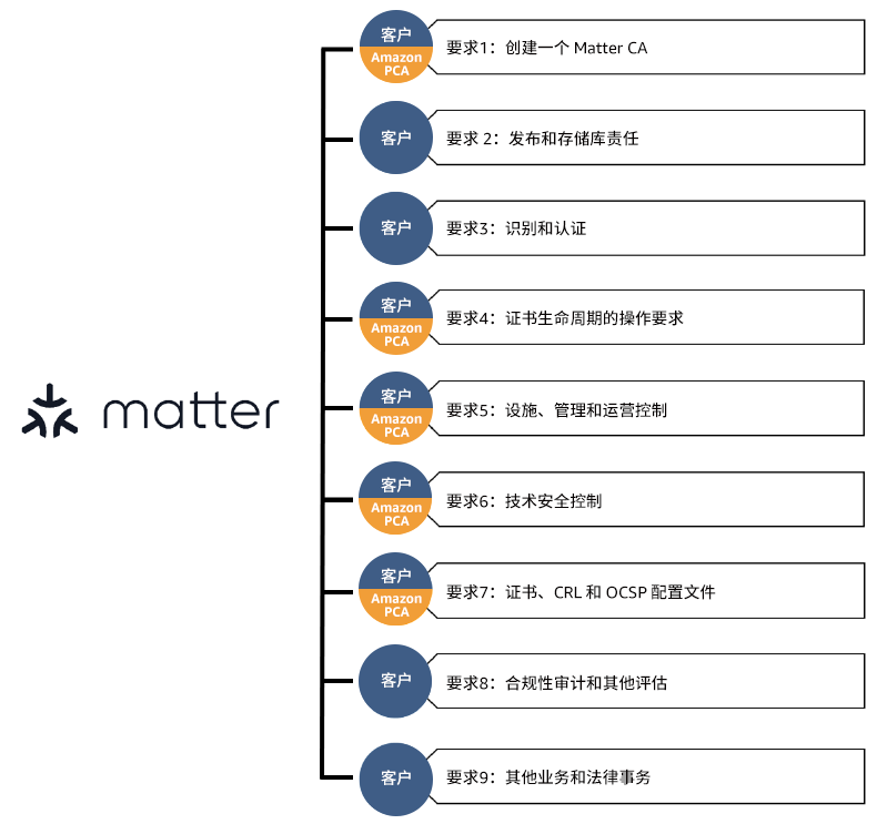 当客户使用 Amazon Private CA 提供的 CA 基础设施服务来签发 Matter 证书时,应详细制定实施计划,并证明其符合 CSA 联盟对于 Matter PKI CP 的要求。Matter PKI CP 不仅仅是个技术标准,它涵盖了人员、流程和技术。