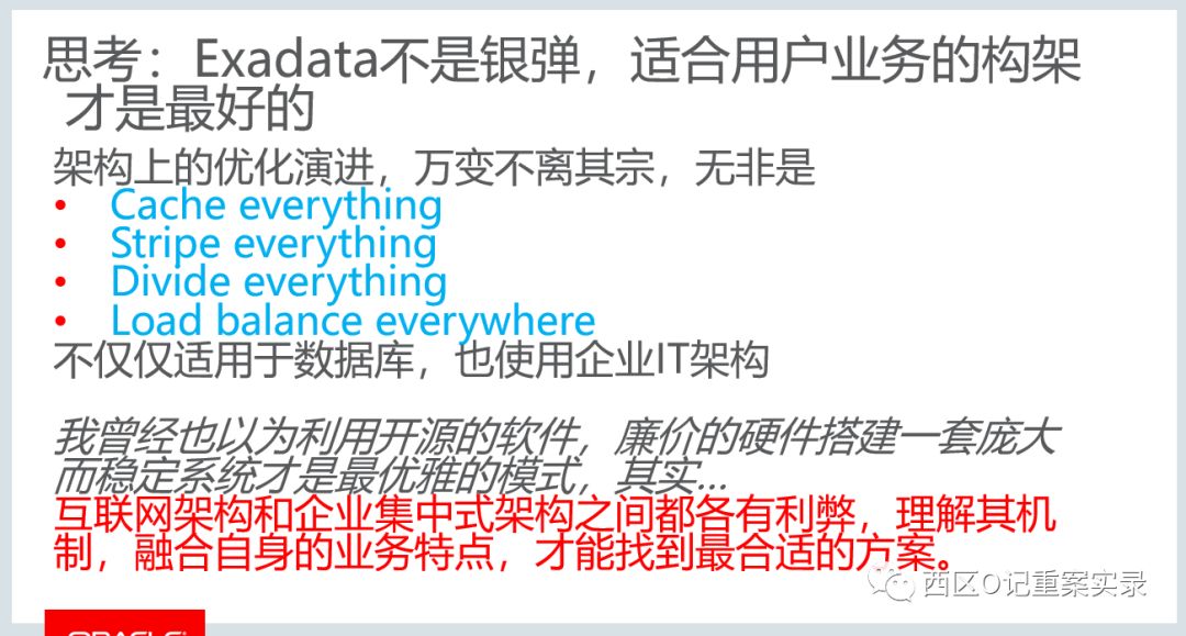 一体机管理和性能优化分享完成,主要的内容如下。理论+实践+原理+案例解析Exadata的性能奥秘,讨论数据库构架,企业的IT架构发展演变,对比评估市场同类产品,为客户提供更多的视角,不一样的观点。