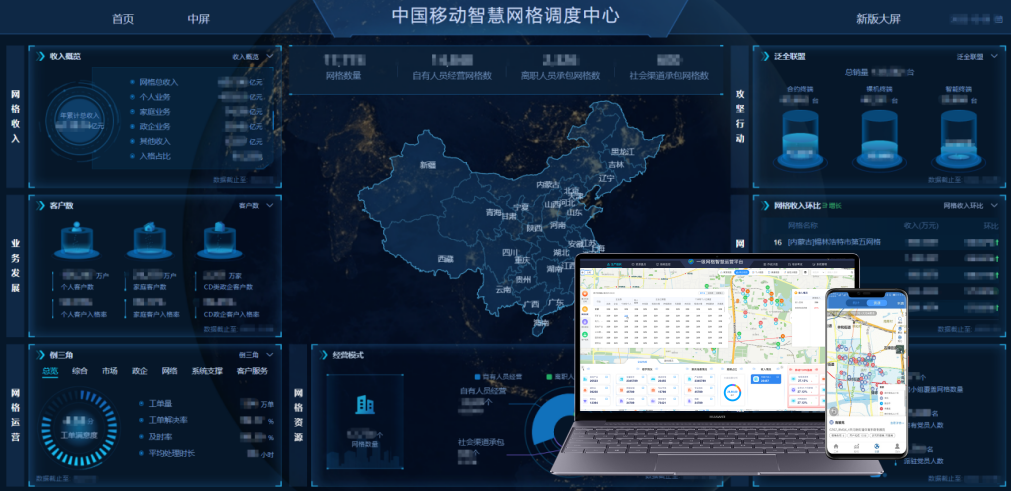 作为行业领先的信息服务提供商,中国移动沉淀自身网格数智化转型实践经验,积累了丰富的管理资产和成熟的平台能力。自2019年起中国移动全面推进网格数智化转型工作,携手华为共同构建了基于数据、能力和应用层架构的网格智慧运营平台,助力市场、政企、人力、财务等条线实现网格化转型。数据层面,实现了党建、营销、产品、网络、财务等全域数据入网格;能力层面,构建了面向管理的“监控感知能力”,面向市场发展的“智慧调度能力”,面向作业的“生产支撑能力”以及面向服务的“服务优化能力”;应用层面,通过打造大、中、小三屏联动的组合产品,支撑高层决策部署、中层运营管理、基层生产提效,助力中国移动在个人市场、家庭市场、政企市场、新兴市场全向发力。