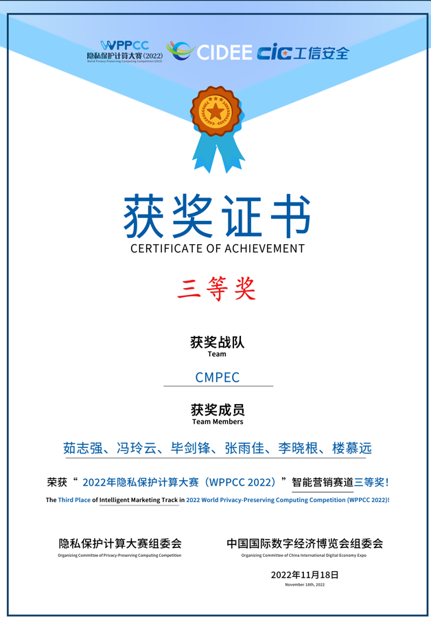 日前,由中国国际数字经济博览会组委会主办,国家工业信息安全发展研究中心承办的2022年隐私保护计算大赛(WPPCC 2022)决赛在线上顺利举行。经过激烈的角逐和严格的评审,中国移动信息技术中心梧桐大数据"CMPEC" 团队在100多家企业和高校中脱颖而出,荣获"智能营销"赛道三等奖。
