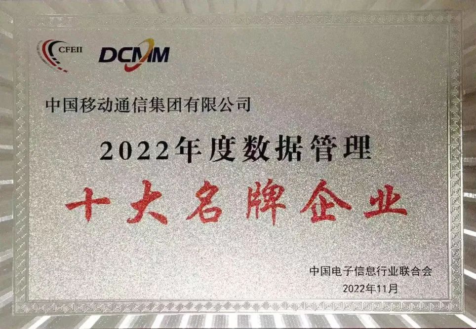 2月17日,在中国电子信息行业联合会举办的“首届中国数据治理年会”上,中国移动获得“2022年度数据管理十大名牌企业”称号,中国移动信息技术中心、广东公司、江苏公司、浙江公司、河北公司多项数据治理成果荣获“DCMM(数据管理能力成熟度评估模型)优秀案例”。中国移动是累计通过DCMM四级认证最多的单位。