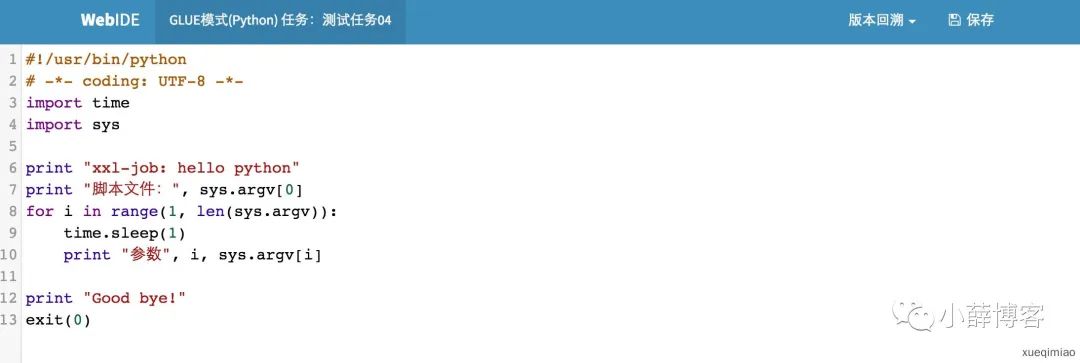 • 19、GLUE:提供Web IDE,支持在线开发任务逻辑代码,动态发布,实时编译生效,省略部署上线的过程。支持30个版本的历史版本回溯。