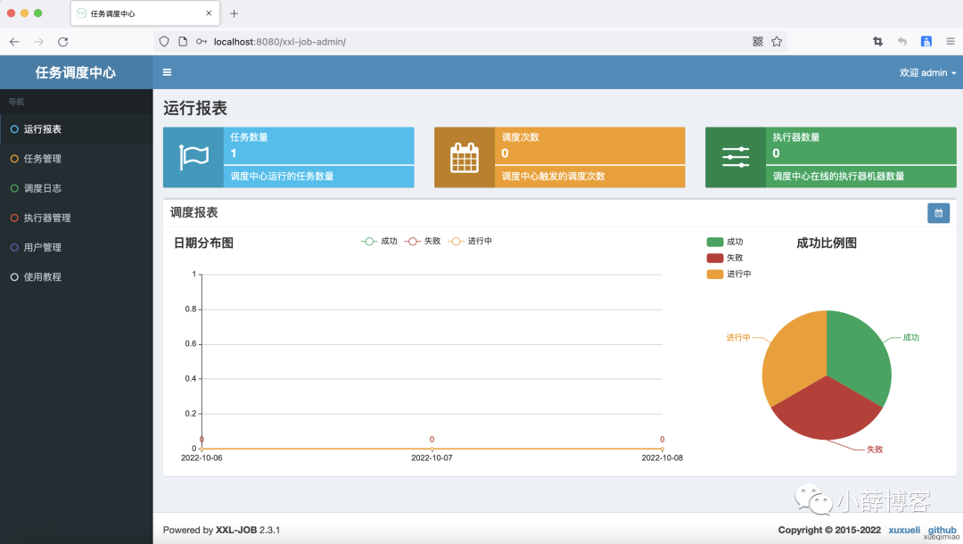调度中心访问地址:http://localhost:8080/xxl-job-admin (该地址执行器将会使用到,作为回调地址)