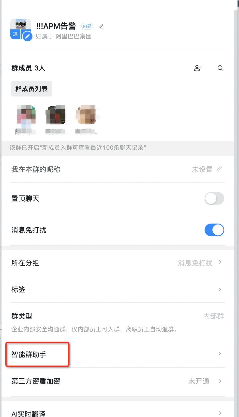 配置钉钉群机器人必须使用电脑版的钉钉,登录电脑版钉钉创建钉钉群(此过程略,例如创建后的群名为!!!APM告警),然后点击群右上角的“设置”,然后点击“智能群助手”,如下图所示: