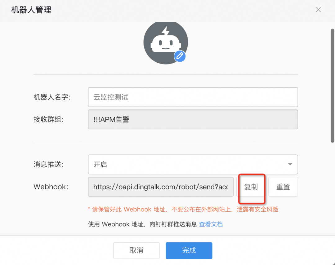 在接下来的页面中会出现一个Webhook调用的URL,点击“复制”,类似如下