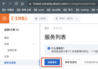 打开函数计算FC的控制台(https://common-buy.aliyun.com/package?planCode=package_activatefc_cn),选择左侧菜单的“服务与函数”,然后在右边的窗口中选择“创建服务”,如下图所示: