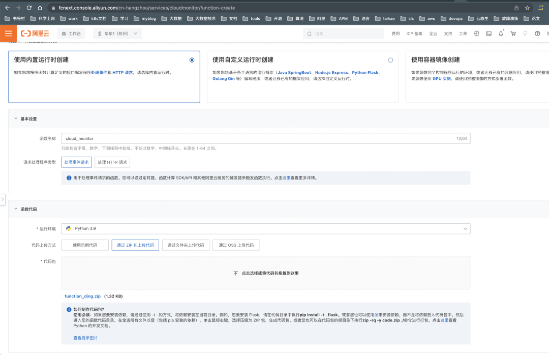 选择“通过zip包上传代码”,其中代码的详细地址如下(也可以手工下载此文件,然后从本地上传):