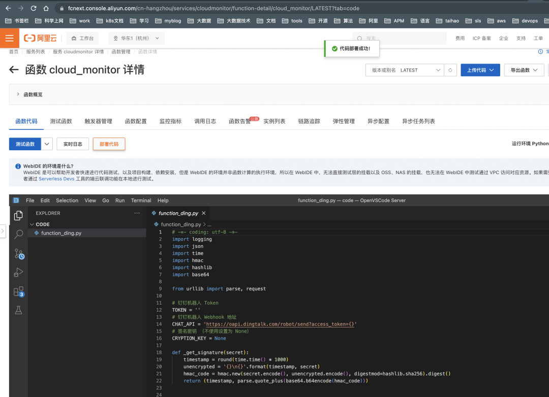 https://emr.oss-cn-hangzhou.aliyuncs.com/best_practice/cms/function_ding.zip上传后,在代码TOKEN处填写创建的钉钉机器人token,如下图所示: