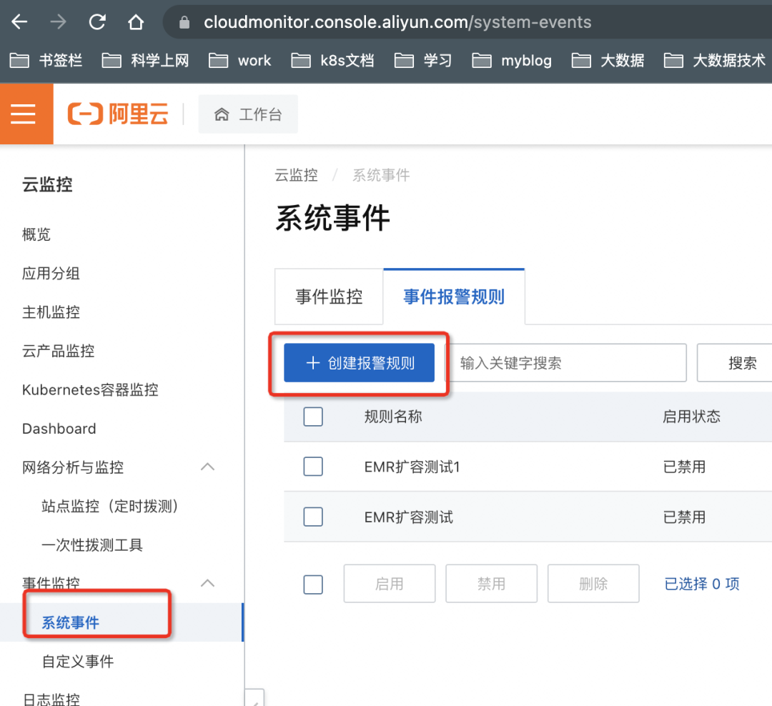 打开云监控的控制台(https://cloudmonitor.console.aliyun.com/system-events?spm=a2c6h.12873639.article-detail.7.a1dc31043FWjNl),选择左侧菜单的“系统事件”,然后在右边的窗口中选择“创建报警规则”,如下图所示: