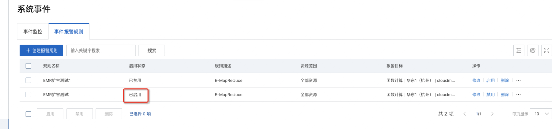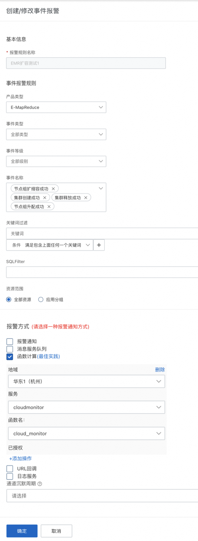 弹出创建窗口后,在产品类型处填写“E-MapReduce”,事件名称填写“节点组扩缩容成功、集群创建成功、集群释放成功、节点组升配成功”为例,资源范围选择“全部资源”(也可以选择应用分组选择您想要监控的集群id),选择函数计算并选择之前配置的服务和函数名,如下图所示: