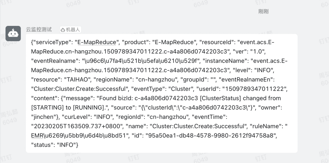 经过上面的文档指引和动手实验,我们基于EMR集群的生命周期管理(如集群创建,停止,集群扩缩,缩容等)都会有对应提醒,其实只需要修改文件“function_ding.zip”里面对应的解析的JSON文件的内容,这个流程可以复制到别的场景,例如ECS的相关操作。