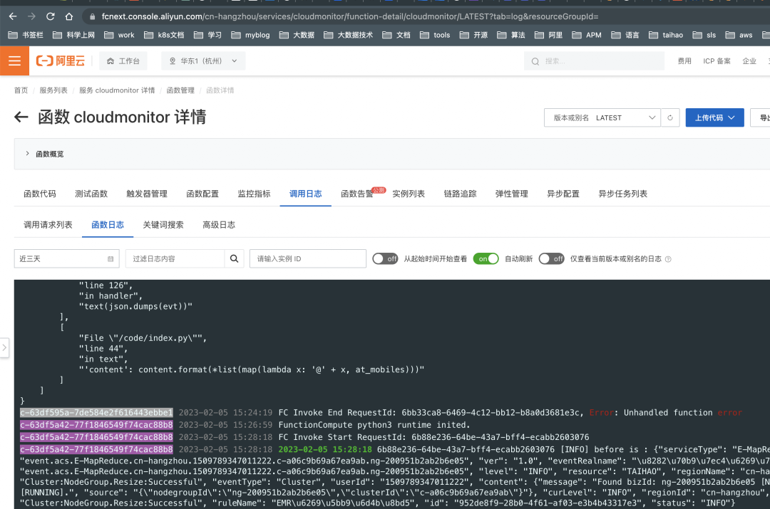 如果启动集群过程中并没有收到对应的提醒,请首先确认对应的环境,查看函数计算中函数调用日志有没有错误,如下图所示: