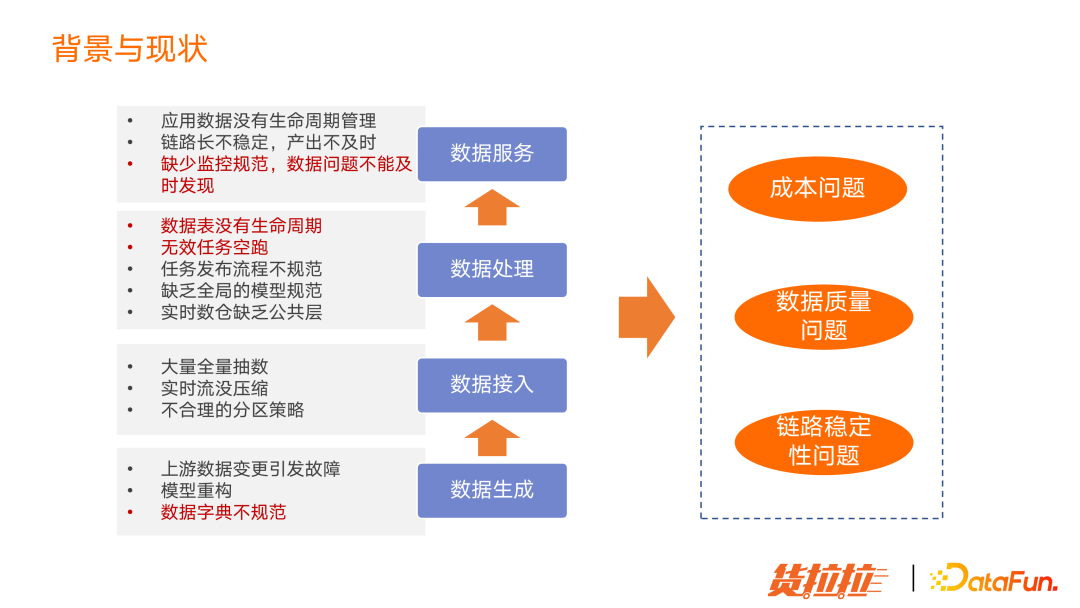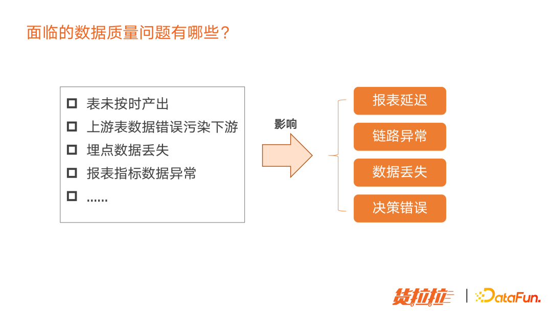 表未按时产出 上游数据错误,污染下游,导致链路异常 埋点数据丢失,无监控造成数据丢失无法发现 报表数据异常,造成决策错误