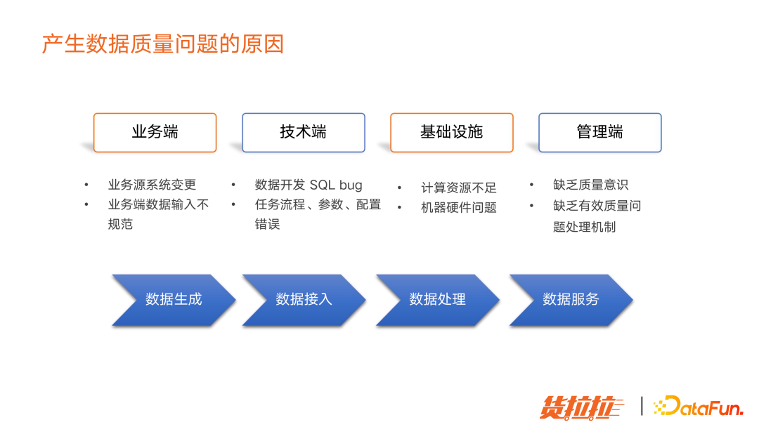 业务端:业务源系统变更,或业务端数据输入不规范,会导致数据生产以及数据接入出现异常。 技术端:数据开发过程中出现的 Bug,或任务参数配置错误,导致任务运行失败。 基础设施:计算资源不足,或网络带宽不足,磁盘被打满,也会影响数据产出。 管理端:缺乏质量意思,缺乏有效质量问题处理机制,质量问题会越来越严重。