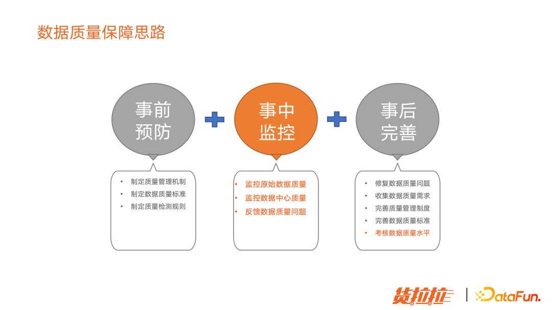 事前:制定机制、标准流程和质量检查规则,预防质量问题。 事中:数据质量平台搭建,可以监控全链路数据质量。 事后:发现质量问题要及时修复,并考核数据链路质量,驱动数据链路负责人做数据质量提升。