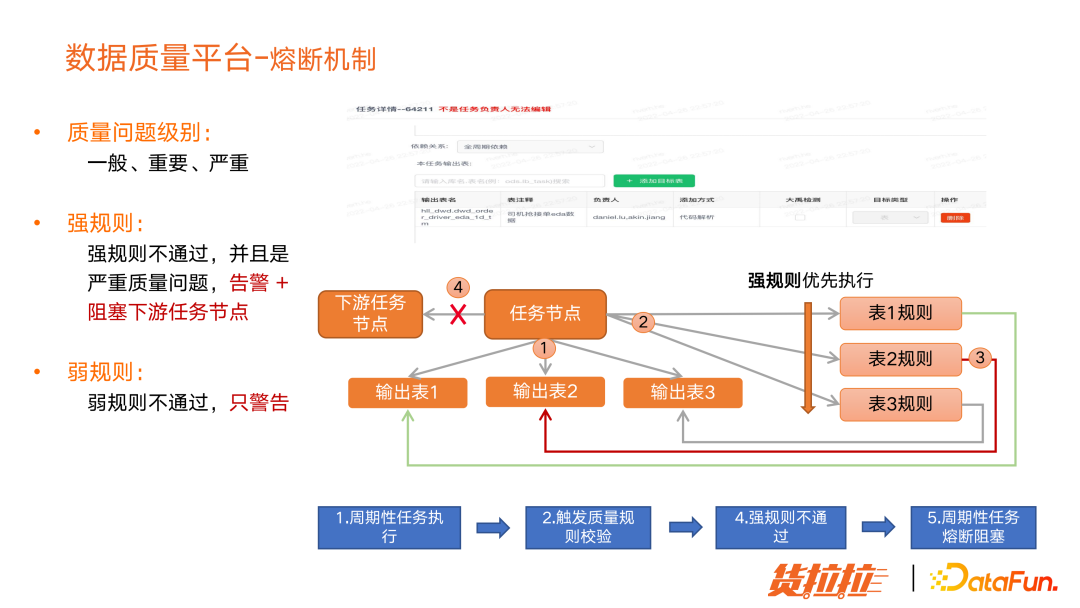 零代码一站式质量监测。 支持表维度管理和主题维度管理:表维度是对单张表做质量规则配置,主题维度是对同一类别的表做相同类别的质量配置。 借助了元数据平台中的数据血缘,完成整个数据链路的质量规则配置。 当质量规则配置完成后,会生成一个质量检测任务,用户可以手动触发制定,也可以设置周期性调度执行,也可以去任务调度平台触发执行。因为一个任务对应一些输出表,当输出表落地后,会触发这个表关联的质检规则执行。如果关联的质检规则是强规则,且强规则检测未通过,会阻断下游任务执行,就能阻止数据质量问题进一步扩散。 质检完成后,会生成质量报告;对于质量检测不通过的,会触发告警。严重的会触发熔断。