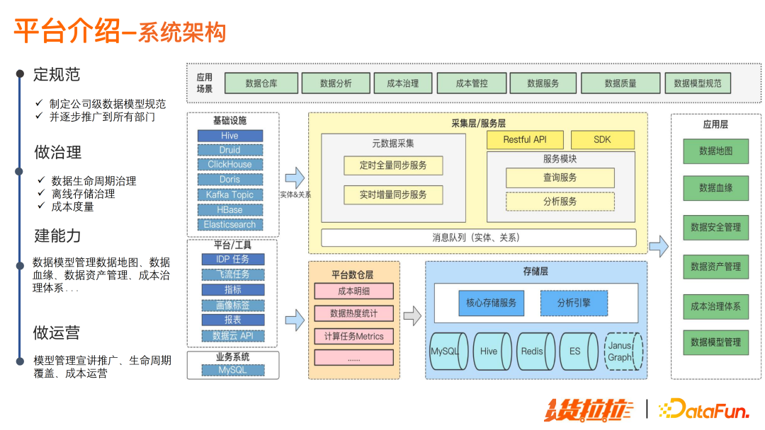 数据地图主要提供找数据和帮助用户理解数据的能力。 数据血缘分析主要是在数据链路出现问题的时候,帮助排查定位问题。 数据模型管理,提供规范落地能力:把所有正式表的建表收归到数据模型管理平台。这样的好处是,如数据安全等级、数据生命周期都会有设置,防止数据出现无序增长的趋势。 成本管控平台,它的作用是度量当前数据资源有哪些,资源消耗是怎样的,每天花了多少钱。 辅助治理措施:冷数据归档、数据生命周期管理能力。 成本运营机制:可以让用户自驱地做成本运营,不用做保姆式的人治。 数据资产管理:主要提供数据目录管理、数据标准管理,供评估数据资产; 数据质量管理:提供全链路的数据质量监控,有问题可以及时发现和处理,防止问题进一步扩散,可以及时止损。