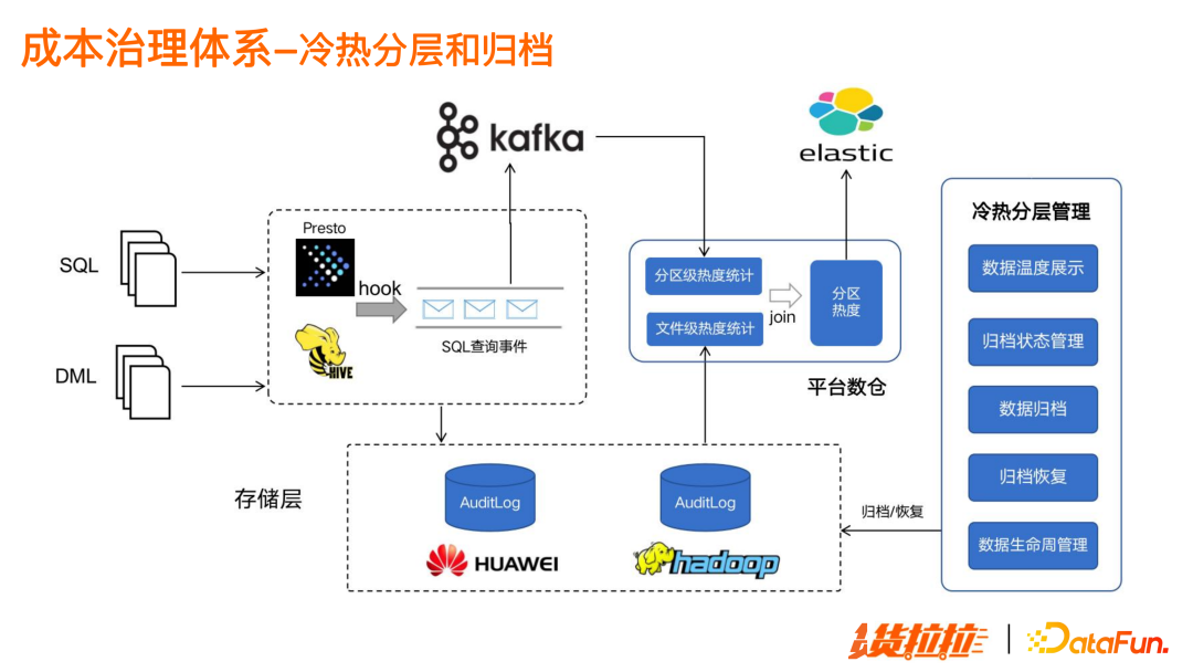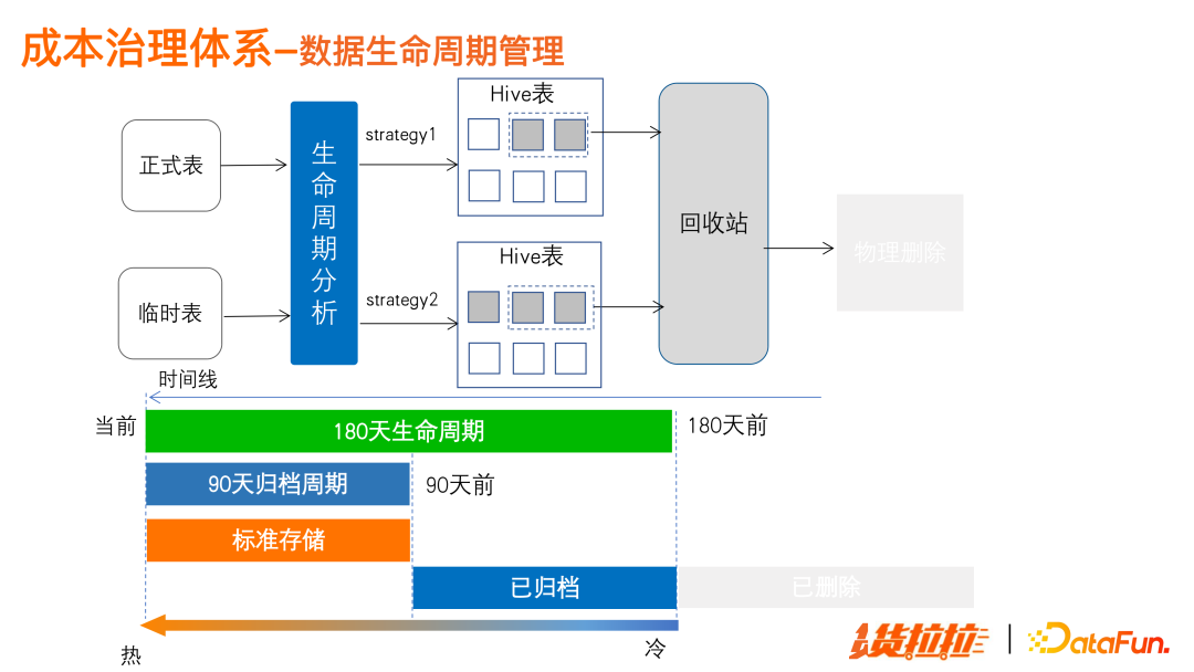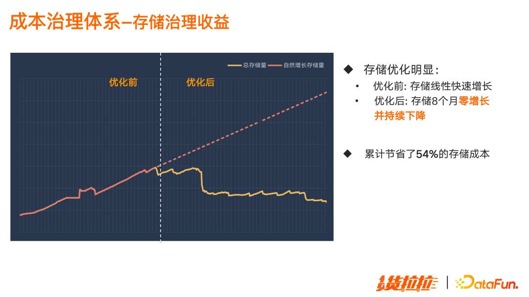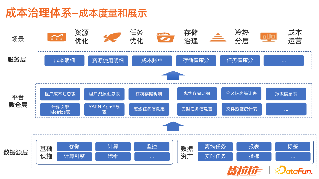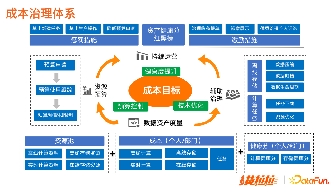 首先建立资源预算机制,通过预算预警和限制,从部门层面控制整体成本使用。 其次,落地数据资产度量体系。能够清晰掌握各项资源消耗,并核算成部门和个人级别的成本明细,转换成健康分,就能非常客观地度量成本使用情况。 并且,配合有效的辅助治理措施,对离线存储和计算任务进行技术优化。