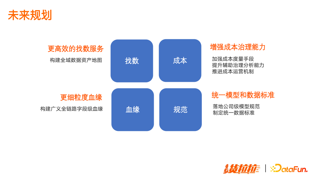 更高效的找数服务 更细粒度的血缘 增强成本治理能力 推广统一模型和数据标准