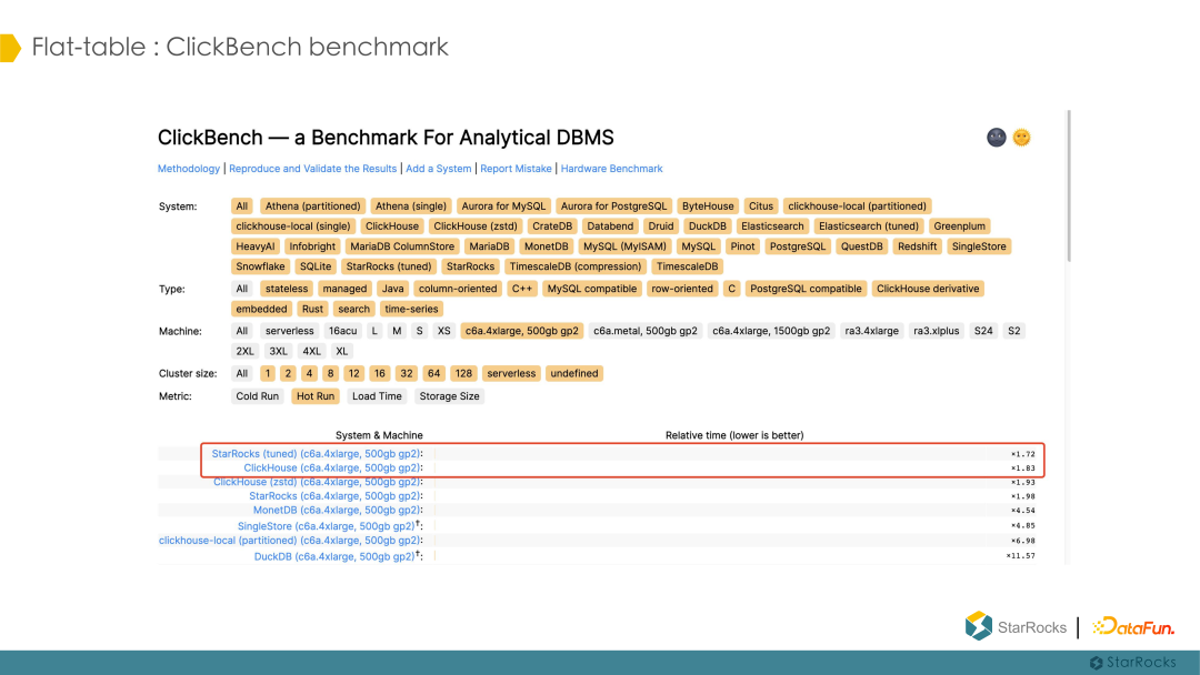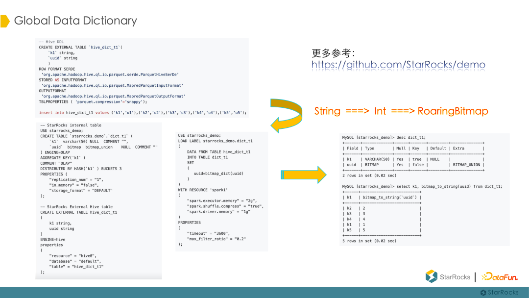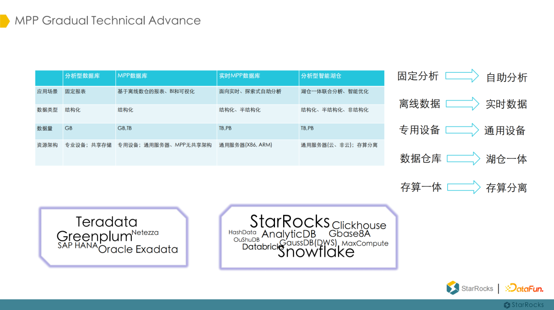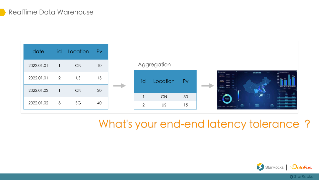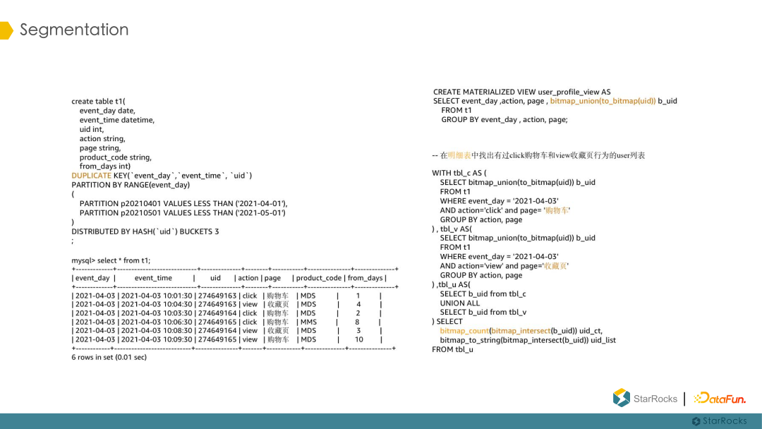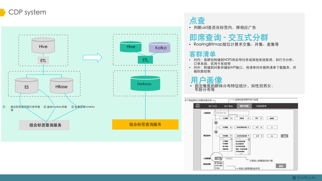 即席分析:基于 StarRocks 的向量化查询、CBO 优化器技术可以对复杂查询生成一个最优的查询计划,适应用户拖拉拽产出的 SQL。另外也可以对湖或仓进行联邦的分析。 实时分析:StarRocks 可以秒级从消息系统摄入数据,并和 Apache Flink 整合做一些数仓的实践。 用户画像:可以利用 StarRocks 做一些用户画像系统的落地。 固定报表:这是 StarRocks 的看家本领,主要是固定报表场景下的 OLAP 分析。