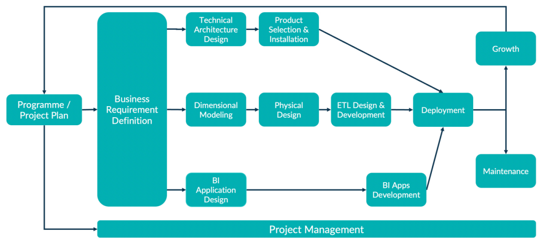 在这种项目实施过程中,一般情况下需要项目经理、数据架构师、数据分析师、数据工程师等等多个角色配合。项目实施路线图可以参照如下: