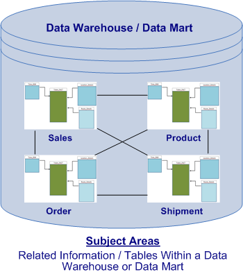数据仓库的建设通常会面向不同的主题进行建设,针对不同的主题进行建模。例如,在电商领域可能会按照销售、订单、产品、物流等等主题进行建模。例如下图: