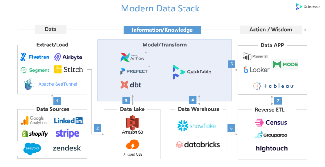数据建模和转换 - 数据在进入数据湖仓后,一般仅仅是做过简单的数据展平的数据。但是这些数据想要去支持决策或者构建新的数据应用,还需要进一步的处理。比如有很多字段内容是嵌套的Json格式,有的字段是文本内容,需要进行关键词抽取。另外,做报表可能还需要多个数据做关联,做预聚合等等工作。这些处理后的数据,可能会被继续写回到数据仓库,也可能会输出到BI系统,甚至可能生成专门的垂直类数据应用,比如用户行为分析应用、电商分析应用等等。做数据建模和转换的产品包括了DBT,QuickTable等。