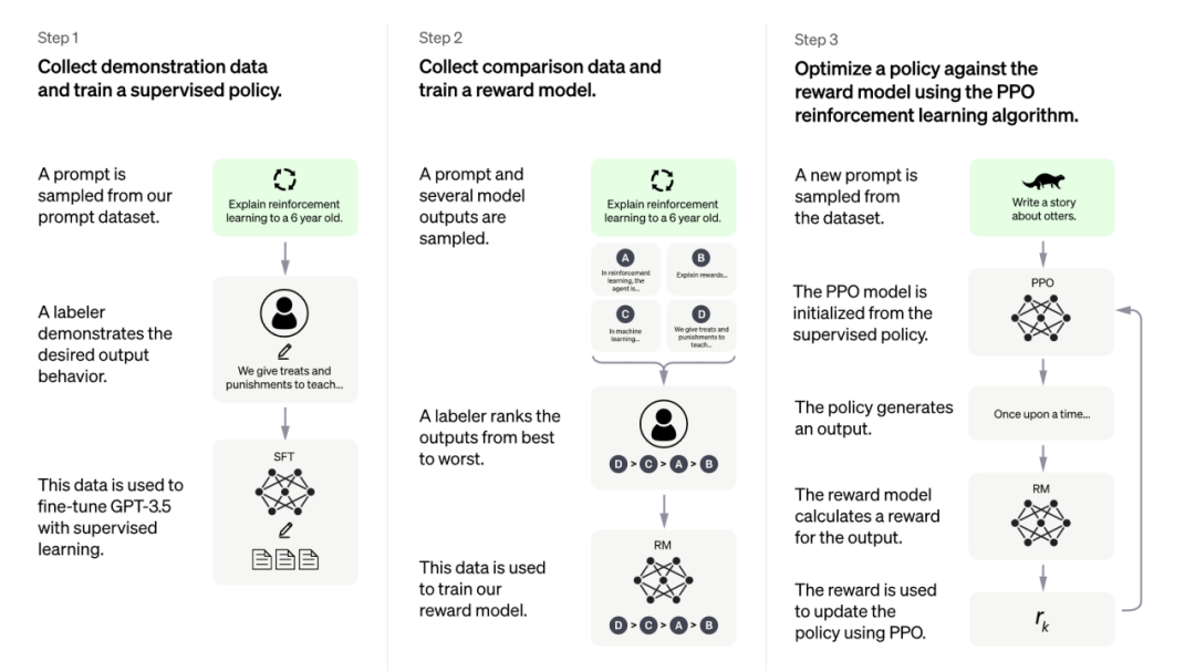 使用奖励模型和更多的标注过的数据继续优化微调过的语言模型,并且进行迭代。