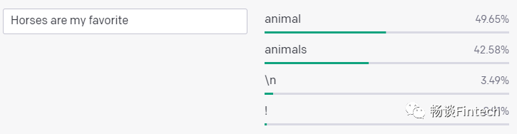 例如:“Butterscotch”翻译成四个标记:“But”、“ters”、“cot”和“ch”。许多标记以空格开头,例如“ hello”和“ bye”。给定一些文本,该模型确定下一个最有可能出现的标记。例如,文本“Horses are my favorite”最有可能跟随标记“animal”。