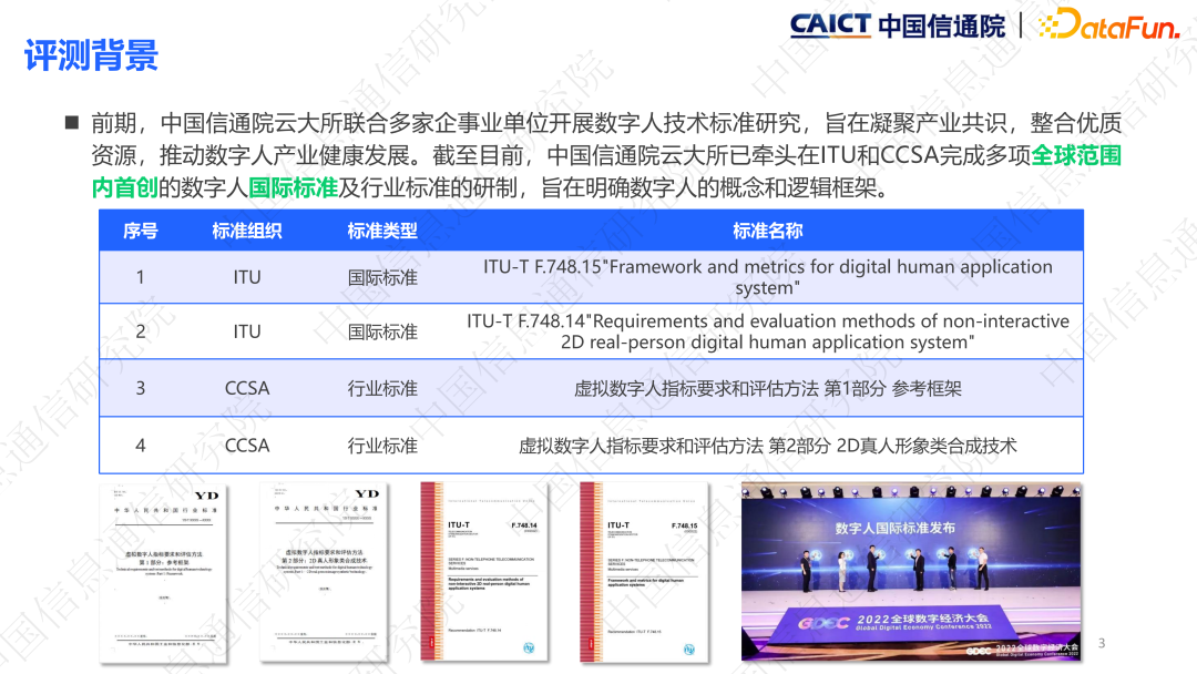 前期,我们联合了多家企事业单位开展数字人技术标准研究。目前我们已经牵头在国际电信联盟(ITU)和中国通信标准化协会(CCSA)完成了多项全球范围内首创的数字人国际标准级行业标准的研制。其中的两个国际标准也在 2022 年 7 月底的全球数字经济大会上进行了发布,右下角就是当时发布的照片。