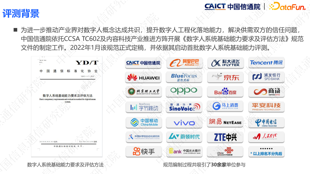 除了以上工作,为了进一步回应刚提到的问题、推动产业界对数字人概念达成共识、提升数字人工程化落地能力、解决供需双方的信任问题,信通院依托中国通信标准化协会 TC602 及内容科技产业推进方阵开展《数字人系统基础能力要求级评估方法》规范文件的制定工作。规范制定也得到很多头部互联网公司以及重点行业企业的高度重视和广泛参与,一共有 30 余家企业参与了规范的制定。参与企业包括:阿里、科大讯飞、腾讯、蓝色光标等。该规范在 2022 年 1 月正式定稿,我们也根据该规范开展了首批数字人基础能力评测。02