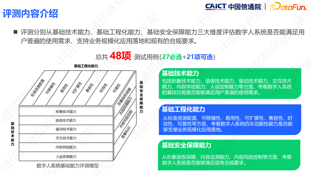 评测内容严格依据标准开展,分别从基础技术能力、基础工程化能力、基础安全保障能力三个维度评估数字人系统是否满足用户需求、支持业务规模化落地和现有合规要求。- 基础技术能力包含形象、语音、驱动、交互、内容提供、人设定制等方面,主要考察数字人系统的基础功能是否满足用户普遍的使用需求。