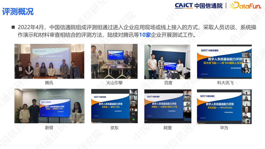 2022 年 4 月,中国信通院组成评测组通过进入企业应用现场或线上接入的方式,采取人员访谈、系统操作演示和材料审查相结合的评测方法,陆续对腾讯等 10 家企业开展测试工作。
