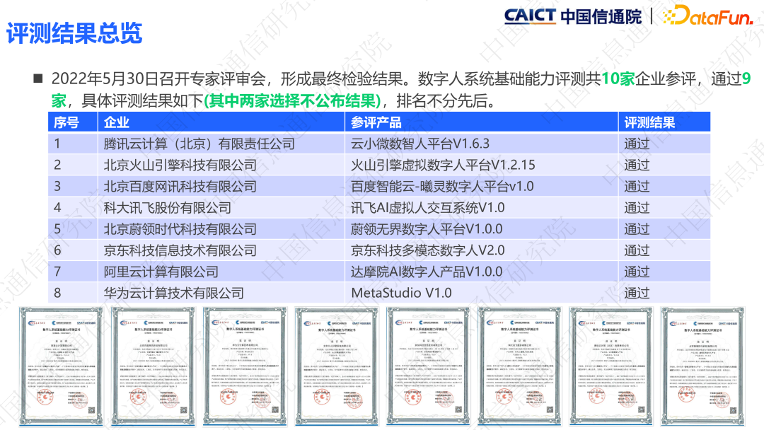 在 2022 年 5 月我们召开了专家评审会,形成了最终的检验结果。共有 10 家企业参与测评,有 9 家通过了测评,有两家选择不公布结果。上图显示的是首次通过评测的企业,包括:腾讯、火山引擎、百度、科大讯飞、蔚领时代、京东科技、阿里云、华为云。