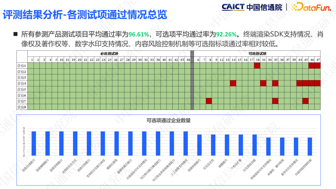 我们对参评产品的结果进行了分析,数据显示:所有产品测试项目平均通过率为96.61%。可选项相对低一些,平均通过率为 92.6%。终端渲染 SDK 支持情况、肖像权及著作权等、数字水印支持情况、内容风险控制机制等可选项指标通过率相对比较低。