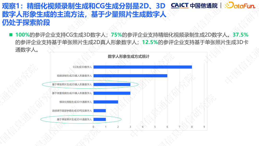 除了对参评结果进行数据分析,我们也从此次评测中观察到以下几点情况。观察1:精细化视频录制生成和 CG 生成分别是 2D、3D 数字人 形象生成的主流方法,基于少量照片生成数字人仍处于探索阶段