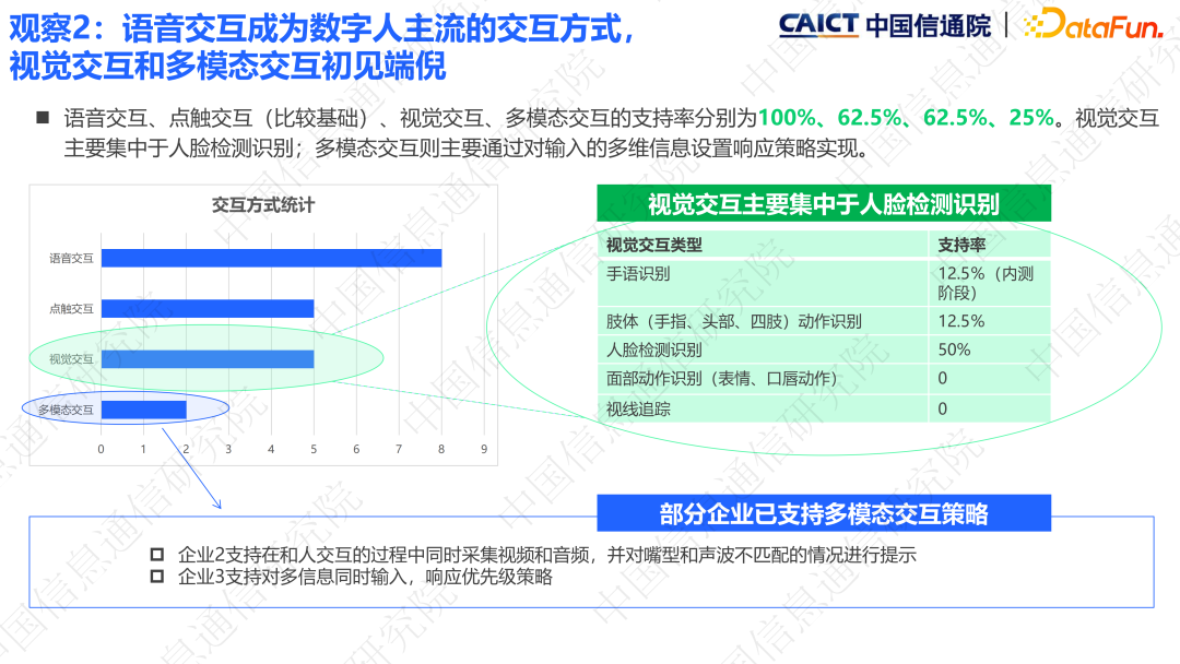 观察2:语音交互成为数字人主流的交互方式,视觉交互和多模 态交互初见端倪测试中发现 100% 产品和应用使用了语音交互作为数字人交互方式,同时发现已经有部分参评系统开始支持视觉交互和多模态交互。视觉交互主要集中于人脸检测识别,对于手语识别、肢体(手指、头部、四肢等)动作识别、面部动作(表情、口唇动作)识别、视线追踪等其他视觉交互多数还停留在预研或者内测阶段;多模态交互则主要通过对输入的多维信息设置响应策略实现,如已有参评系统支持在和人交互的过程中同时采集视频和音频,并对嘴型和声波不匹配的情况进行提示。由于多模态交互可融合视觉、听觉、触觉等多方面信息,从整体上提高人机交互的自然度和精确度,多模态数字人已成为产业界争相探索的方向之一。