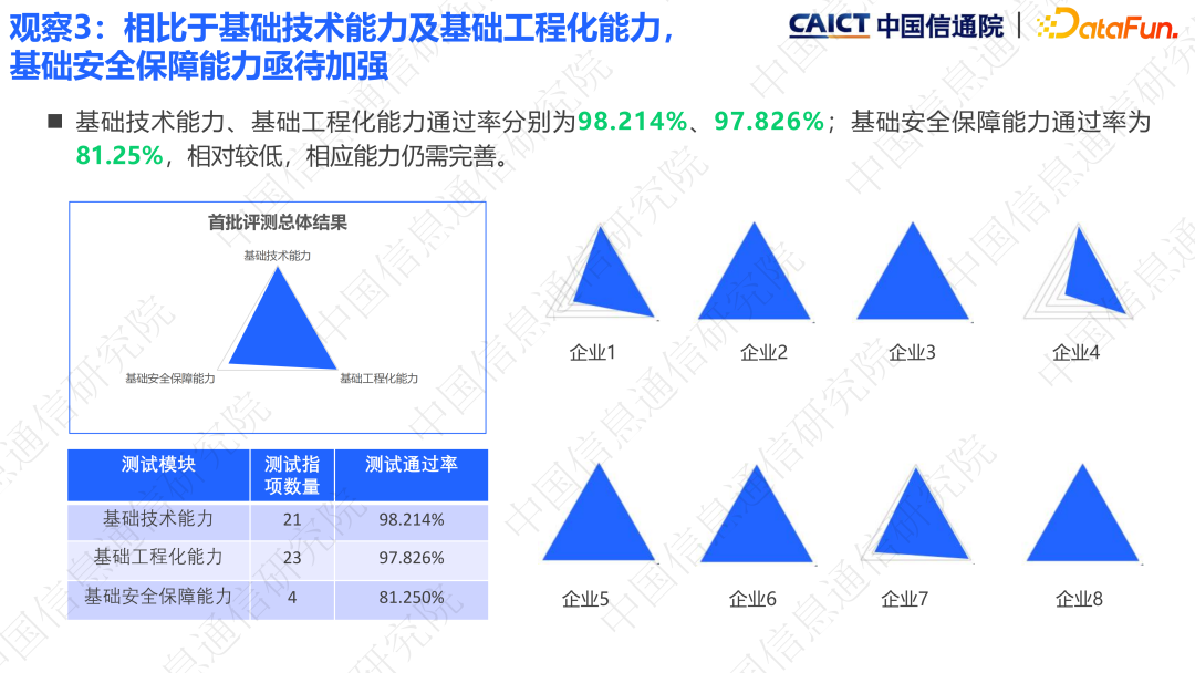 观察3:相比于基础技术能力及基础工程化能力,基础安全保障能力亟待加强基础技术能力、基础工程化能力通过率分别为 98.214%、97.826%;基础安全保障能力通过率为 81.25%,相对较低,相应能力仍需完善。尽管有八分之五的参评企业对于基础安全保障能力的各测试项支持的比较全面,但目前还只解决了有无的问题,仍然存在较大的改进空间。例如“内容风险控制”测试项,尽管大部分的参评企业都具备相应的内容审核能力,但仍是复用语音的审核机制,并未开发针对数字人这类多模态交互系统的定制化的审核机制。