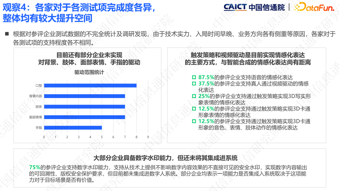 观察4:各家对于各测试项的完成度各异,整体均有较大提升空间由于技术实力、入局时间早晚、业务方向各有侧重等原因,各家对于各测试项的支持程度各不相同,整体均有较大的优化空间。以“驱动范围”测试项为例,并不是每个参评企业都支持所有的驱动范围,目前还有部分企业未实现对背景、肢体、面部表情、手指的驱动;再如“情感化表达”测试项,所有参评系统的情感化表达主要采用触发策略或视频驱动实现,与完全智能合成的情感化表达尚有距离;再如“数字水印”测试项,尽管有 75% 的参评企业具备相应能力,但均未将其与数字人系统能力做打通。