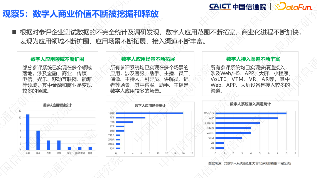 根据对参评企业测试数据的不完全统计及调研发现,数字人应用范围不断拓宽,商业化进程不断加快,具体表现在以下三个方面:一是应用领域不断扩围,部分参评系统已实现在多个领域落地,涉及金融、商业、传媒、电信、娱乐、移动互联网、能源等领域。二是应用场景不断拓展,所有参评系统均已实现在多个场景的应用,涉及客服、助手、主播、员工、偶像、主持人、引导员、讲解员、记者等场景。三是接入渠道不断丰富,所有参评系统均已实现多渠道接入,涉及 Web/H5、APP、大屏、小程序、VoLTE、VTM、VR、AR 等。未来随着相关技术的不断成熟及“元宇宙”的持续探索,数字人应用定将进一步链接经济社会生活场景,在更多领域大放异彩。