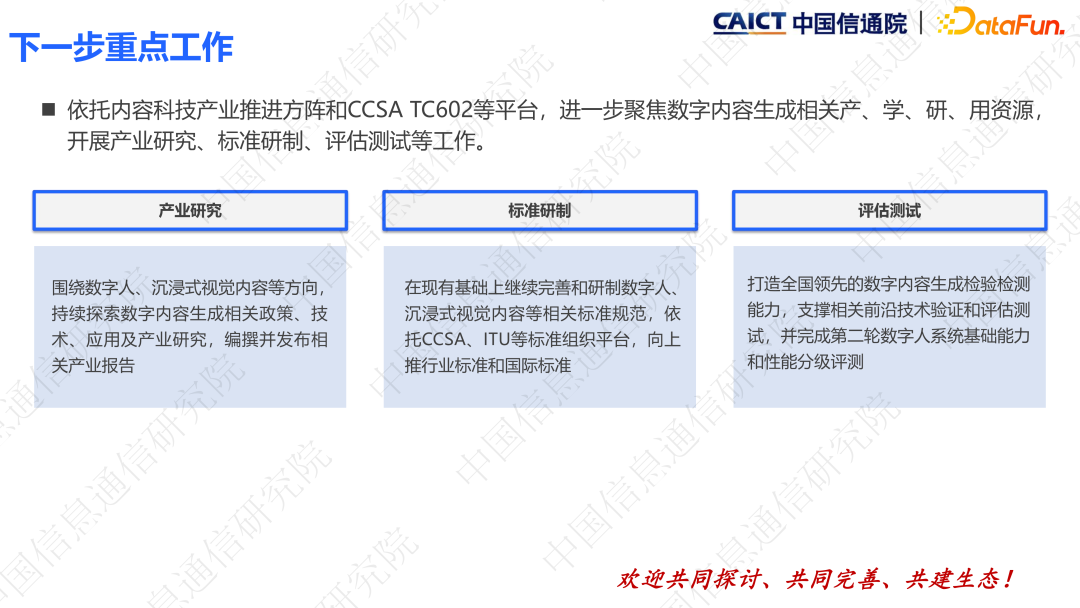 最后说一下我们下一步的重点工作。中国信通院云大所会持续依托内容科技产业推进方阵和 CCSA TC602 等平台,进一步聚焦数字内容生成的产、学、研、用资源,开展产业研究、标准研制、评估测试等工作。- 在产业研究方面,我们会围绕数字人、沉浸式视觉内容等方向,持续探索数字内容生成的相关政策、技术、应用及产业研究,编撰并发布相关产业报告。我们今年撰写了《人工智能生成内容的白皮书》,已在在 2022 年 9 月的世界人工智能大会上发布。