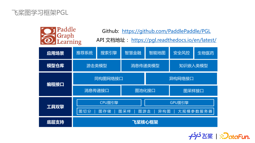 上图是我们的一个图学习的框架 PGL。大概是在两年前发布的,主要是基于飞桨的 PaddlePaddle 深度学习框架,在上面搭建了一些包括图的引擎,以及图网络的一些编程的接口,上面我们也放了很多预置的模型,供大家去使用。感兴趣的同学可以去我们的Github,可以 pip install 装我们的框架,以及跑一些示例。