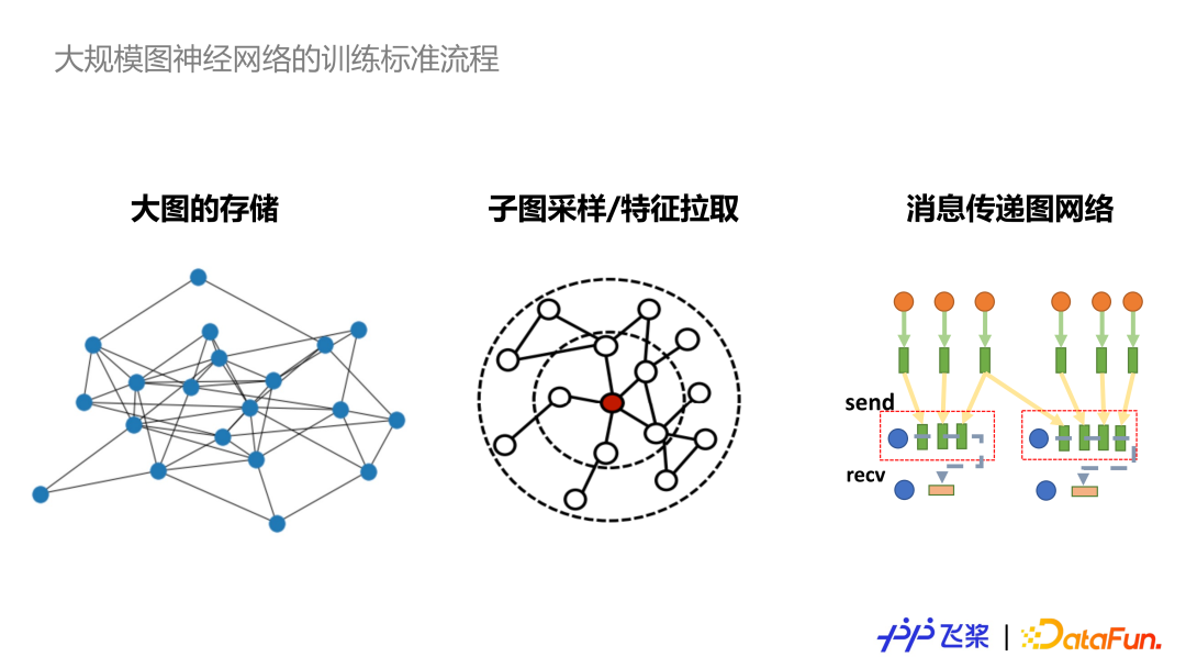图神经网络大规模的训练,目前是有一套比较成熟的标准流程。特别是大图的情况下,我们通常会沿用 2017 年的一篇论文叫做 GraphSAGE,它主要的理念就是训练在大图里面的某些带标签的节点,我们通常会对某个点的邻居进行采样 sample,后面用 aggregation 就是不停地聚合或者通过消息传递的图神经网络去代表我们中心的一个点。对于不同的框架,我们都会主要解决三个问题,第一个是我们的图是怎么存的,第二个是我们的子图是怎么采样,包括一些特征是怎么从图里面拉取出来。最后是高层图网络的一些消息传递算法是怎么定义的。